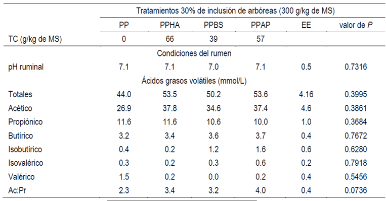 El pH no se afectó por la inclusión y la especie de las arbóreas tropicales (P>0.05). La concentración molar (mmol/L) de los AGV (acético, propiónico, butírico, valérico, isobutírico e isovalérico) no fue afectado (P>0.05) por los tratamientos PP, PPHA, PPBS y PPAP, encontrándose promedios en la concentración molar de 34.1, 10.9, 3.4, 0.4, 0.8 y 0.3, respectivamente (Cuadro 3).