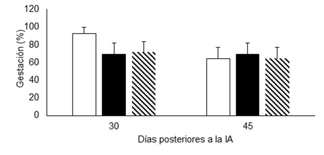 Figura 1 Porcentaje de gestación 30 y 45 días después de la IA en vacas Holstein del grupo testigo (barras blancas), VCE3 (barras negras) y VEC6 (barras achuradas)
