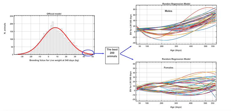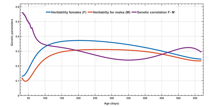 The live weight (LW) of 2,777 animals (1,377 females and 1,400 males with 53,258 individual data between 30 and 600 days of age), born between February 2000 and June 2011, was analyzed using a random regression (RR) model to estimate the genetic components of (co)variance throughout the age-sex scale. The pregnancy rate (PR) and the LW adjusted to 548 days of age (WA548) were studied using a multitrait (MT) model, an increase in the heritability (h2) estimates for PR compared to the classical univariate model (0.08 ± 0.03 vs. 0.11 ± 0.02) was observed, increasing the accuracy of the genetic value (GV) for PR in 15.7 %. The genetic correlation (rg) between the PR and the WA548 was 0.31 ± 0.11. The RR showed that, through time, the LW could not be considered as an expression of the same trait in both sexes, as the rg were less than 0.60. The principal component analysis showed that there are important changes in the animal growth on the age scale represented in these data. A prominent dimorphism of genetic origin manifested, estimated as the difference between the male and female GVs in LW, which shows a positive relationship with the GVs of PR.