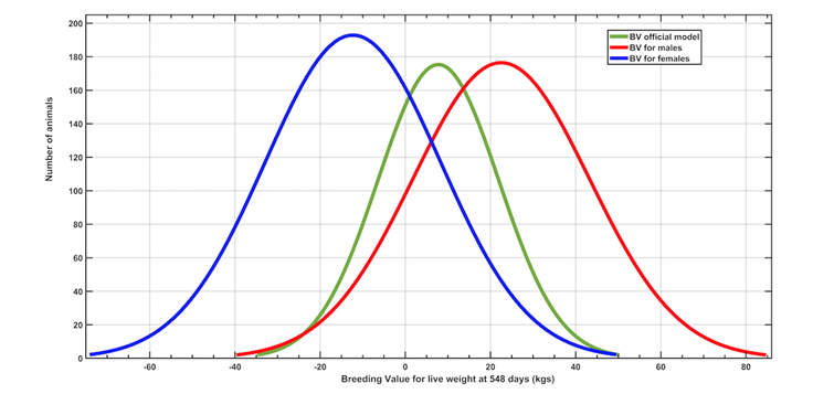 Figure 2 Frequency distribution of genetic values for weight at 548 days of age according to the current model and by means of random regression (model 6)
