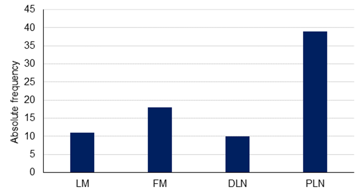 Figure 1 Frequency of contamination with Salmonella spp. in bovine samples of lean meat (LM, n=363), fatty meat (FM, n=382), deep lymph nodes (DLN, n=399), and peripheral lymph nodes (PLN, n=401), collected between April 2017 and December 2018
