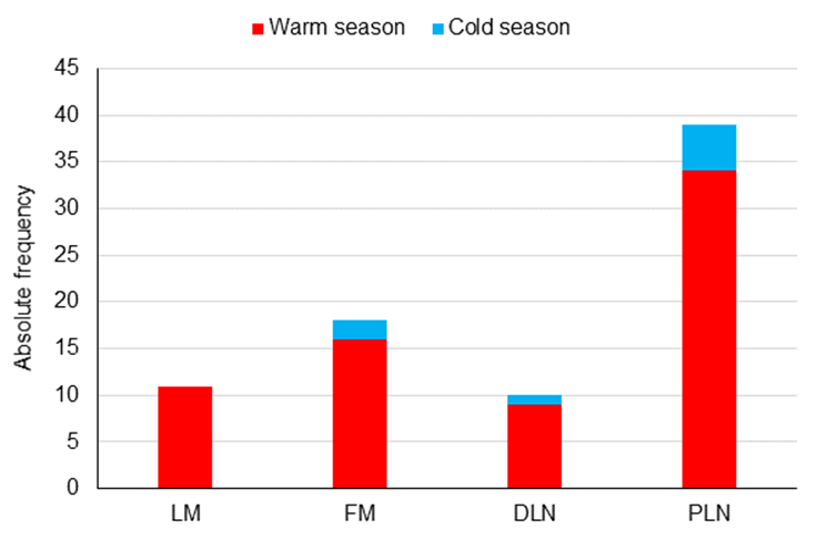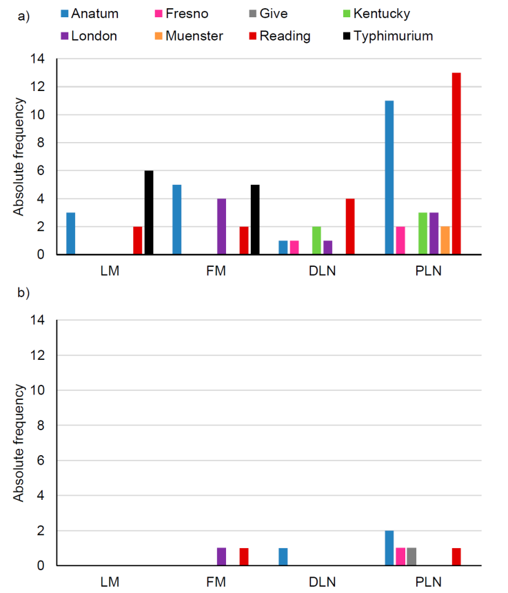 Figure 3 Number of S. enterica subsp. enterica isolates by serovar and source in the warm (a) and cold (b) season. LM: lean meat (n=363), FM: fatty meat (n=382), DLN: deep lymph nodes (n=399), PLN: peripheral lymph nodes (n=401)