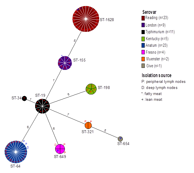 Moreover, it is interesting to analyze why some serovars were only present in meat samples (e.g., Typhimurium), while others were detected in all matrices (e.g., Anatum and Reading). Notably, the Anatum serovar was previously reported as a predominant strain in non-clinical samples, especially in lymph nodes19,20. These evidences suggest the possibility that some Salmonella strains are better adapted to colonize and survive in particular ecological niches. However, in the context of the present study, it is difficult to determine whether the relative representation of serovars in lymph nodes depends on specific genetic factors. It is also necessary to use analyses with greater discriminatory power than MLST to explore more precisely the intra- and interserovar phylogenetic relationships, and the evolutionary dynamics of these populations. This will be the focus of future contributions in the comparative genomics field.