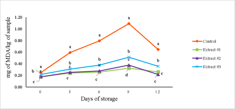 The results of TBA-RS (Figure 3) showed a significant difference (P≤0.05) between the samples. The three extracts were able to decrease the concentration of malonaldehyde (MDA) with respect to the hamburgers without extract throughout the 12 d of storage, with extracts #1 and #2 being the ones that achieved a significantly better effect in relation to extract #3.
