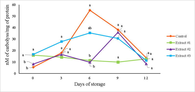Figure 4 Effect of extracts on carbonyl concentration of pork hamburgers cooked and stored at 4 °C for 12 d