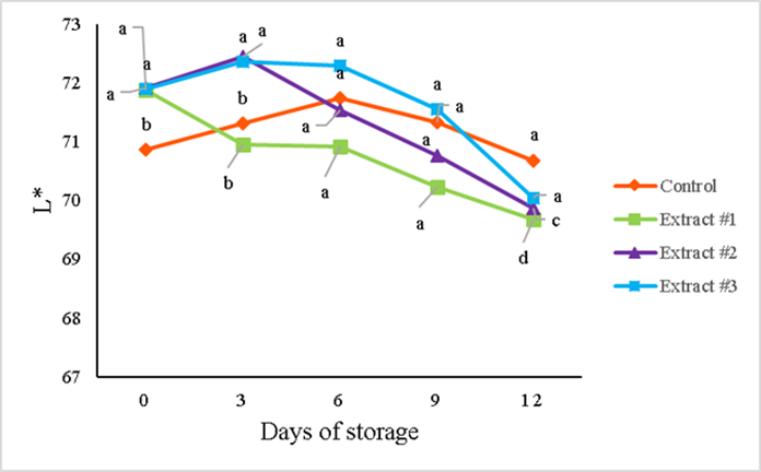 Figure 5 Effect of extracts on the luminosity or brightness of pork hamburgers cooked and stored at 4 °C for 12 d