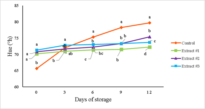 Figure 6 Effect of extracts on the color of pork hamburgers cooked and stored at 4 °C for 12 d