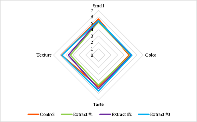The results of the sensory evaluation (Figure 7) indicate that, in relation to the attributes of smell and color, there was no significant difference (P˃0.05) between the treatments, that is, the application of the extracts did not perceptively modify the smell or the color of a cooked meat. In the evaluation corresponding to the attribute of taste, there were significant differences (P≤0.05) between the different sources of variation used in the experimental design, with hamburgers with extract #3 being the ones that had the highest preference among the panelists, surpassing the hamburgers without extract, while the ones with the lowest acceptance were the hamburgers with extract #1. Regarding the attribute of texture, there were statistically significant differences between treatments, being the hamburgers added with extract # 3 the ones that showed greater acceptability for this attribute and equalizing the texture of the hamburgers that did not have it. While the hamburgers that were added with extract #1 were the ones that had the least acceptance among the tasters. In general, the addition of the three extracts to the hamburgers did not have a negative effect on the preference of the tasters, since the results of the four attributes (smell, color, taste and texture) evaluated were on the scale of 4 to 6, which ranges from “I neither like it nor dislike it” to “I like it very much”, with the preference for hamburgers with extract #3 among diners standing out.