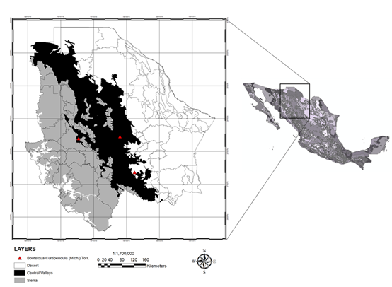 Los datos de precipitación y temperatura se obtuvieron de CONAGUA22 para el periodo del 2000 al 2019. Por otra parte, el Índice de Vegetación de Diferencia Normalizada (NDVI, por sus siglas en inglés) se calculó a partir de escenas obtenidas del Landsat ETM+7 y Landsat OLI8 (https://glovis.usgs.gov/). Además, 196 registros verificados de la presencia del pasto banderita [Bouteluoa curtipendula (Michx.) Torr.] en cada una de las tres regiones ecológicas en que se dividió el estado.