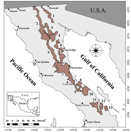 El estudio se realizó durante el periodo comprendido entre noviembre de 2021 y noviembre de 2022, en las cordilleras Sierra Juárez y Santa Isabel; en la región norte y centro del estado de Baja California, respectivamente (Figura 1). Estas áreas representan un hábitat continuo para el borrego cimarrón, ya que incluyen topografía accidentada, cañones y pendientes pronunciadas14,15. Sierra Juárez tiene una extensión de 42,364 ha y se localiza entre las ciudades de Tecate y Mexicali; y Santa Isabel, abarca una superficie de 65,961 ha en la costa del Golfo de California, a 90 km al sur de la ciudad portuaria de San Felipe15. Estas áreas pertenecen a la ecorregión Desierto de San Felipe, donde predomina el matorral desértico micrófilo, caracterizado por especies vegetales como la gobernadora (Larrea tridentata), la hierba del burro (Ambrosia dumosa), el ocotillo (Fouquieria splendens), el agave desértico (Agave deserti) y el palo fierro (Olneya tesota)16. La temperatura media anual oscila entre los 12 y 22 °C. La precipitación promedio mensual oscila entre 0.0 mm y 0.8 mm, y se presenta durante todo el año, aunque los meses de invierno son los más húmedos17.