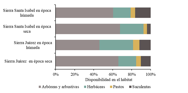 En Sierra Juárez y Santa Isabel, el hábitat del borrego cimarrón se caracterizó por una alta disponibilidad de especies arbóreas y arbustivas, y en menor frecuencia de pastos (Figura 2). La disponibilidad de especies varió en función del sitio y la época del año (P<0.05). En Sierra Juárez se identificaron 52 especies pertenecientes a 23 familias taxonómicas, las principales fueron: Asteraceae (7), Cactaceae (5), Fabaceae (5) y Asparagaceae (4). La diversidad de especies de plantas en esta cordillera fue mayor en la época húmeda (H’= 3.69) que en la época seca (H’= 3.43). En Santa Isabel se identificaron 55 especies correspondientes a 21 familias taxonómicas de las cuales Asteraceae (9), Cactaceae (6), Fabaceae (6) y Euphorbiaceae (5) fueron las más comunes. La diversidad vegetal en Sierra Santa Isabel en la época húmeda (H’= 3.89) fue mayor que en la seca (H’= 3.55). Mantener una diversidad alta de forraje en el hábitat del borrego es importante porque no existe una única especie que cubra todos los requerimientos nutricionales27.