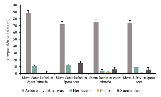 Los herbívoros silvestres están adaptados al consumo de una gran diversidad de tipos de forraje, en función de gradientes ambientales que influyen en la disponibilidad del alimento30. Al respecto, se registraron 31 especies que conforman la dieta de la población de borrego cimarrón en Sierra Juárez. Durante la época seca se identificaron 25 especies, mientras que, en la época húmeda el consumo ascendió a 27 especies (Cuadro 1). Las formas biológicas de mayor consumo fueron las arbóreas y arbustivas, con una frecuencia de consumo del 74.7 % y 73.8 % en época húmeda y seca, respectivamente. Las herbáceas representaron el 4.11 % de la dieta en la época húmeda y el 9.39 % en la época seca. El aporte de pastos a la dieta fue mayor durante la época húmeda (1.77 %), en tanto que, el de suculentas fue más notable en la época seca (5.64 %; Figura 3). Aunque el índice de diversidad de Shannon mostró valores más elevados durante la época húmeda (H’= 3.05) que en la seca (H’= 2.97), no se encontraron diferencias en la diversidad de la dieta entre ambas épocas del año.