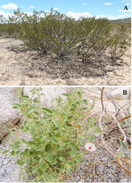A. Gobernadora (Larrea tridentata), de la familia Zygophyllaceae (fotografía de Comisión Nacional Forestal); B. Malva del desierto (Hibiscus denudatus), de la familia Malvaceae (fotografía de James Varnell). Ambas son especies de arbustos perennifoloios nativos de México.
