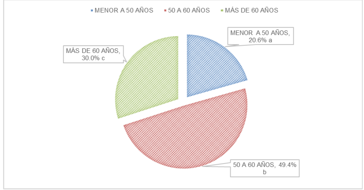 El rango de edad de los productores es de 18 a 86 años, con un promedio de 49.6 años, la cual fue similar entre tipo de tenencia y tamaño de hato (P>0.05). El 20.6 % de los productores son menores de 50 años; el 49.4 % están entre 50 y 60 años, y el 30 % tiene más de 60 años, respectivamente (P<0.01) (Figura 2).
