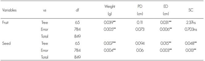 v.s = Variation sources; df = Degrees of freedom; pd = Polar diameter; ed = Equatorial diameter; sc = Shape coefficient; *= Probabilities of F≤ 0.05; ** = F value; is= Insignificant.