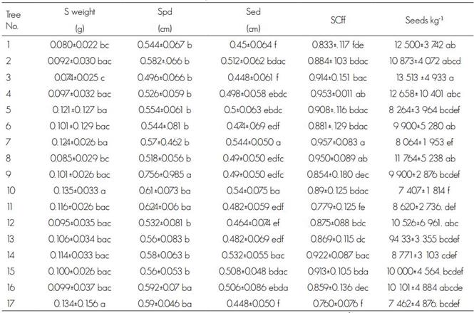 S weight = Seed weight; Spd = Seed polar diameter; Sed = Seed equatorial diameter; SCff = Shape coefficient; Seeds kg-1 = Seeds per kilogram.