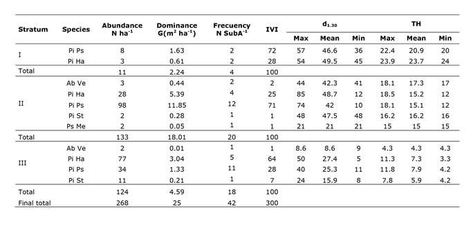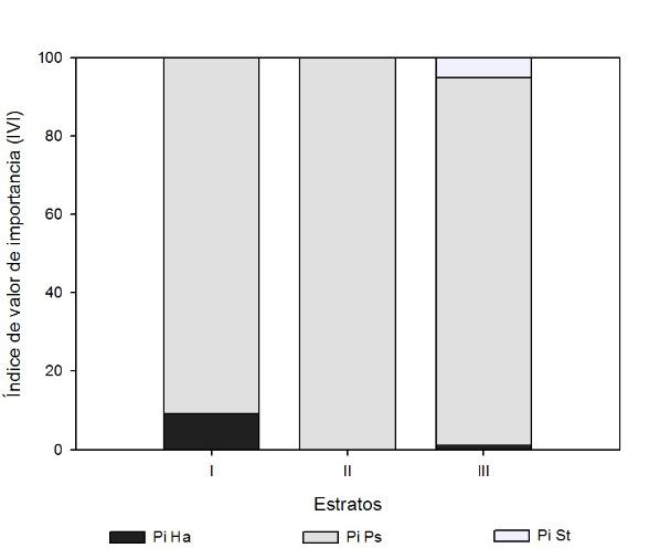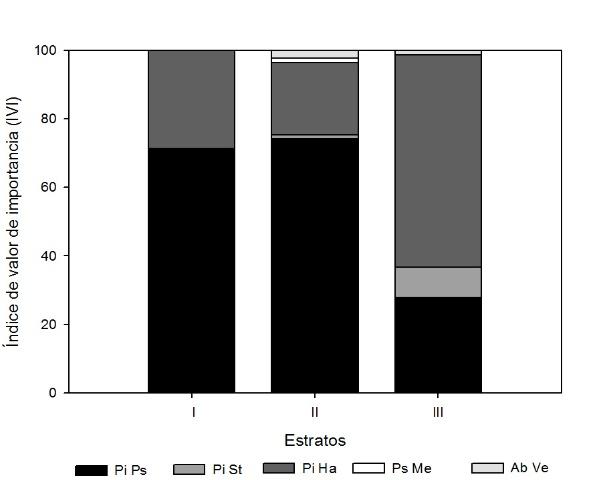 The diversity of heights in the three strata of A1 presented Pinus pseudostrobus as the dominant species (72% in stratum I), with a minimum difference in the trend of its dominance with respect to stratum II (71%) and stratum III (28%); Pinus hartwegii and Abies vejarii increased their importance in strata II and III, with values of 25% and 2% of IVI in stratum II, while in III Pinus hartwegii and Pinus strobiformis recorded 64% and 7% of IVI, respectively (Figure 2).