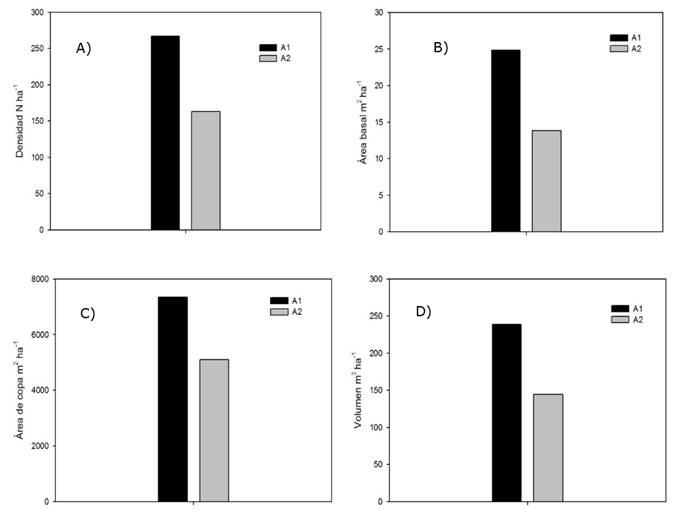The density in A1 was represented by 267 individuals per hectare and A2 by 163; the basal area of A1 was 24.83 m2 ha-1, greater than that of A2, 13.83 m2 ha-1, which can be explained by a higher number of individuals found with larger diameters and heights. On the other hand, the crown area of the first zone was 7.35 m2 ha-1, similarly higher than the second area, of 5 103 m2 ha-1, which is related to the basal area. The volume calculated in A1 was 238.89 m3 ha-1 also higher than that of A2 (144.24 m3 ha-1), which is associated with its coverage and basal area (Figure 4).
