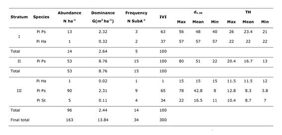 Pi Ps = Pinus pseudostrobus; Pi St = Pinus strobiformis; Pi Ha = Pinus hartwegii; Ps Me = Pseudotsuga menziesii; Ab Ve = Abies vejarii; SubA = Sub area (400 m2); IVI = Importance Value Index; d1.30 = Diameter at 1.30 m; TH = Total Height.