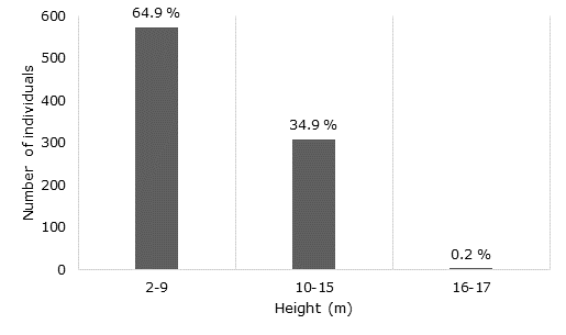 The average height in the total of the sites sampled in the El Limón ejido was 8.4 ± 1.9 m, with an interval of 4.1 to 11.2 m (Table 1); the species that reached greater height were Conzattia multiflora and Lysiloma acapulcensis (Kunth) Benth. (16 m), two strata were differentiated: the lower one was constituted by categories from 2 to 9 m (64.9 % of the individuals), and the superior comprised categories of 10 to 15 m (34.9 %); while only 0.2 % exceeded 15 m (Figure 2).