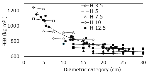 Enes and Fonseca (2014) recorded a similar tendency of variable FEB for natural stands of Pinus pinaster Ait in the North of Portugal. According to Konôpka et al. (2015), the variable FEB decreases progressively as a contribution of tree components that changes with the increase in tree size (D and H), in which a significant change is observed for smaller individuals.