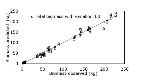 Figure 3 Relation of the total aerial biomass predicted with the constant and variable FEB as a function of the observed total aerial biomass (kg).