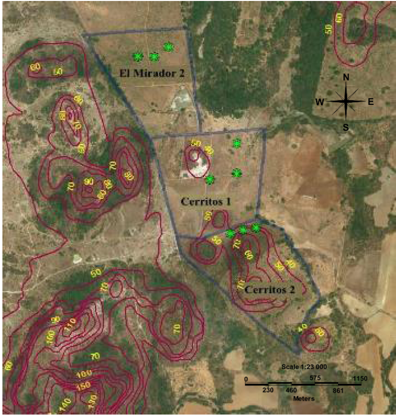 a) Cerritos 1 (10.66 ha); b) Cerritos 2 (23.34 ha), and c) El Mirador 2 (19.95 ha).