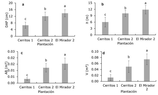 Assuming that all CTSs were managed in the same manner, Figure 3 shows the dendrometric and stereometric behavior of El Mirador 2, Cerritos 1 and Cerritos 2.
