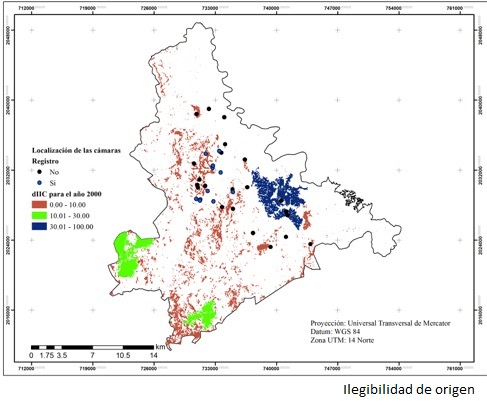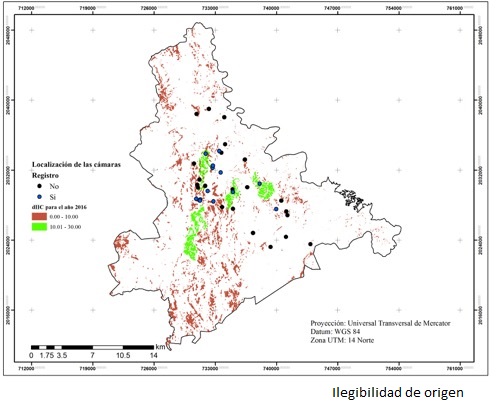 The cameras that filmed ocelots were located inside or very close (1.6 km) to areas with a connectivity value higher than 10 %. These results support the need to maintain vegetation remnants with dense cover and high connectivity, a fact that other authors have pointed out (Martínez-Calderas et al., 2011).
