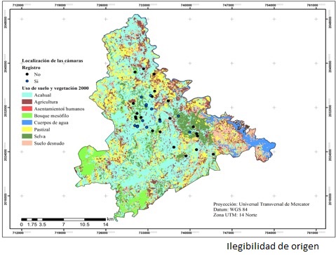 Three sampling periods were carried out. The first was one month (December 2013 to January 2014), with 18 stations at a distance of 1 km between them. The second was conducted during one month (April 2014), with 11 stations spaced every 3 km. The third comprised 3 months (July-September 2014), with 18 stations, the distance between the cameras was 3 km (Hernández-Saint Martín et al., 2013). The sum of the three sampling periods generated information from 36 different points, since eight cameras were damaged and three repeated locations during two seasons; 18 photographic equipment was placed in acahuales and 18 in primary vegetation, however the sampling effort was greater in primary vegetation: 943 trap days and in acahual: 702 days, for a total of 1 645 trap days.