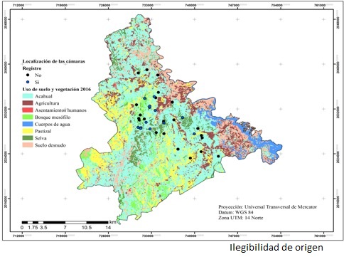 Localización de las cámaras = Location of cameras; Registro = Register; No = No; Si = Yes; Uso de suelo y vegetación = Land use and vegetation; Agricultura = Agriculture; Asentamientos humanos = Human settlements; Bosque mesófilo = Mesophilic forest; Cuerpos de agua = Water bodies; Pastizal = Grasslands; Selva = Tropical rain forest; Suelo desnudo = Bare soil.