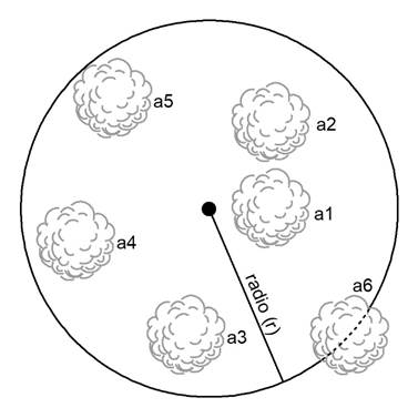For the estimation of this index, 81 sites of different dimensions were selectively located in the following areas, using the sampling method proposed by Prodan (1968), which considers the measurement of six trees and defines the sampling unit as a circular area whose radius extends from the center of the site to the center of the sixth tree (Figure 2). The site was selected considering areas of forest between scrubland and woodland (Müller et al., 2013; Aguilar, 2018), stands of which more than 90 % consisted of trees of the same species, homogeneous areas of full occupancy, and sites with healthy trees, free of physical damage (Lee and Choi, 2019).