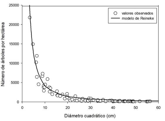 Diámetro cuadrático = Quadratic diameter; Número de árboles por hectárea = Number of trees per hectare; Valores observados = Observed values; Modelo de Reineke = Reineke's model.