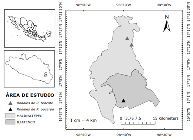 The study area is located between 17°01'45" and 17°15'30" N, and 98°39'24" W (Figure 1), at an altitude of 1 800 to 2 100 m (Figure 2) (INEGI, 2014). It includes Iliatenco and Malinaltepec municipalities in the mountain region of the state of Guerrero, Mexico. The predominant vegetation is pine-oak forests, where P. teocote and P. oocarpa grow naturally in pure stands.
