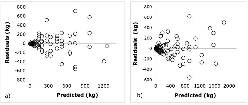 Figure 2 Distribution of residuals (kg) for biomass estimation (kg) in two pinaceae trees in Guerrero: a) Pinus teocote Schltdl. et Cham., b) Pinus oocarpa Schiede.