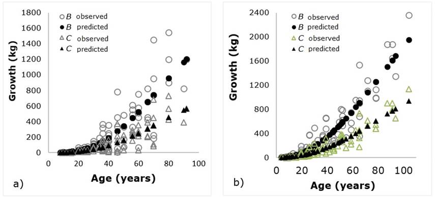 Figure 3 shows the projected growth curves in the B (kg) with the selected model, as well as their equivalence in C. The accumulation of biomass and carbon over time was higher in Pinus oocarpa.