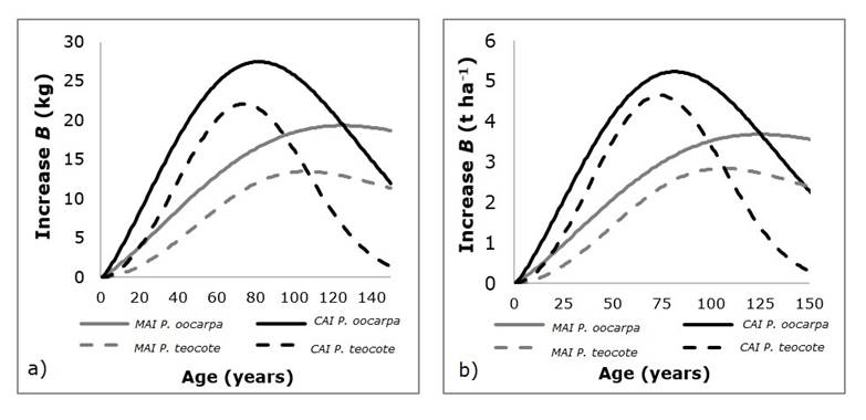 Instant growth (max CAI) was 21.93 kg in P. teocote at 76 years of age, representing 4.6 t ha-1 yr-1 of B and 2.16 t ha-1 yr-1 of C; for P. oocarpa, the max CAI value was 27.4 kg at 84 years of age (Figure 4a), which projected to t ha-1 yr-1 was 5.21 (B) and 2.50 (C). This would result in increases up to the technical shift (CAI=MAI) of 2.81 and 1.32 t ha-1 yr-1 of B and C, respectively, in P. teocote; for P. oocarpa the increases would be of 3.64 (B) and 1.74 (C) t ha-1 yr-1 (Figure 4b).
