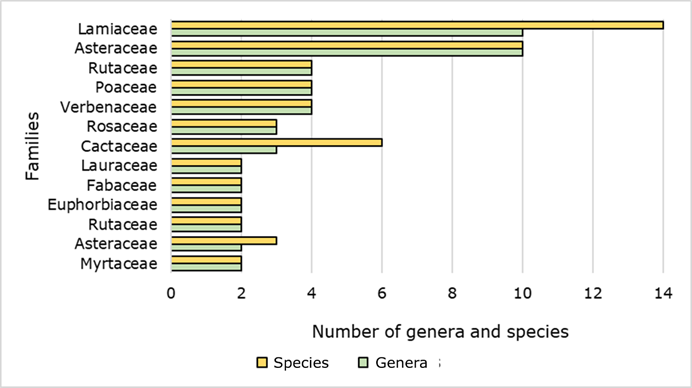 A total of 253 plant species mentioned by the informants were recorded, included in 75 families and 194 genera. Figure 2 illustrates the families with the largest number of genera and species with ethnobotanical use. Of these, 47 % were native, and the remaining 53 % were exotic.
