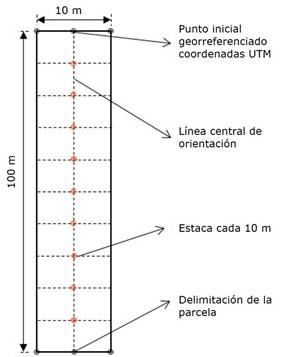 Se instalaron transectos permanentes, generalmente utilizados en el muestreo exploratorio rápido, denominados muestreo tipo Gentry (Gentry, 1982; Montufar & Pintaud, 2006), modificando las parcelas originales de 500×2 m a parcelas de 100×10 m (Figura 2), es decir de 0.1 ha-1 (García-Cox et al., 2023). De esta manera, en cada parcela se registró el número de individuos de las especies de la familia Arecaceae, los cuales se marcaron, colectaron, herborizaron y depositaron en el Herbario ECUAMZ-Ecuador Amazónico. La identificación taxonómica se realizó con el apoyo de claves, catálogos ilustrados y recursos digitales, como Tropicos (Bravo, 2014) y The Plant List (Neill, 2012), para asegurar la precisión en la nomenclatura (Cazzolla et al., 2022; Gentry, 1982; Ter Steege, 1998).