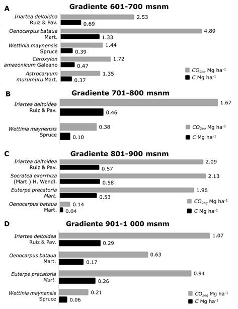 En la altitud de 701 a 800 msnm, el almacenamiento de carbono disminuye, con Iriartea deltoidea como la especie dominante (1.67 Mg ha-1 de CO 2eq ) (Figura 3B). De 801 a 900 msnm, se observa una ligera recuperación, con Socratea exorrhiza (Mart.) H. Wendl. (2.13 Mg ha-1 de CO 2eq ) e Iriartea deltoidea (2.09 Mg ha-1) como principales contribuyentes; mientras que Oenocarpus bataua muestra una caída significativa con solo 0.14 Mg ha-1 (Figura 3C). Finalmente, en el intervalo altitudinal de 901 a 1 000 msnm el almacenamiento disminuye en todas las especies, pero Iriartea deltoidea se mantiene como la dominante con 1.07 Mg ha-1 de CO 2eq (Figura 3D).