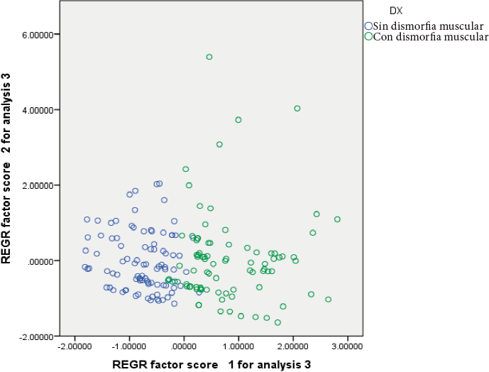 Se obtuvieron clasificados correctamente el 93.3% de los casos agrupados originales, después se obtuvieron clasificados correctamente el 92.7% de los casos agrupados validados mediante validación cruzada. El comportamiento de los participantes con dismorfia muscular y sin dismorfia muscular se observa en la Gráfica 1.