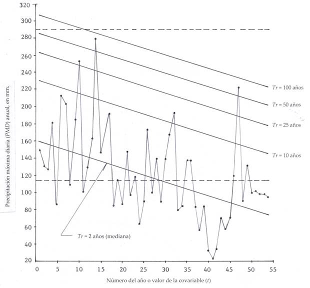 At present, all rain-gauge stations are subject to the effects of global climate change, or their geographical environment suffers physical changes generated by human activities, among the most striking are urbanization, deforestation, dewatering of lagoons and the construction of reservoirs, which alter local atmospheric processes, giving rise to series or records of annual non-stationary PMD, since they present trends (Strupczewski & Kaczmarek, 2001; Khaliq, Ouarda, Ondo, Gachon, & Bobée, 2006; El Adlouni, Ouarda, Zhang, Roy, & Bobée, 2007; El Adlouni & Ouarda, 2008).