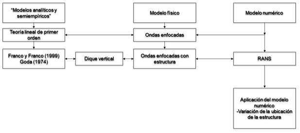 Figura 1 Diagrama de flujo de la metodología para modelar física, numéricamente, y a través de modelos analíticos y semiempíricos la interacción de ondas enfocadas con un dique vertical.