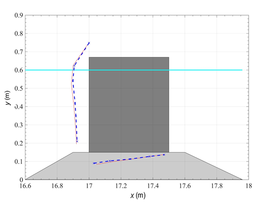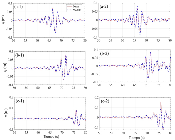 La Figura 8a-2-c-2 muestra las mediciones de superficie libre, realizados en presencia de la estructura (ensayo 2). El modelo numérico reproduce de manera satisfactoria los procesos asociados con la propagación del grupo de ondas (Figura 8a-2 y Figura 8b-2). El oleaje, al interactuar con la estructura, induce la rotura del oleaje, así como el rebase y la reflexión parcial. Es evidente el incremento de la altura de las olas en el ensayo 2 (Figura 8c-2), el cual está asociado con el proceso de reflexión del oleaje en la cara de la estructura. El modelo numérico predice de manera cualitativa la asimetría del oleaje y la transformación del grupo. Sin embargo, subestima la altura del oleaje en la cara de la estructura (ver Figura 8c-2).