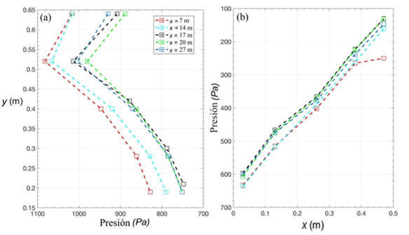 La Figura 10 y la Tabla 5 muestran la comparación entre las presiones máximas medidas en el laboratorio y obtenidas por el modelo numérico. El modelo numérico subestima las presiones en los sensores P1 a P9.