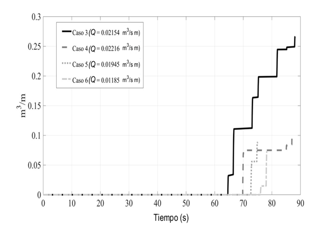 Las presiones dinámicas y subpresiones dinámicas máximas calculadas por el método de Goda (1974) subestiman de manera significativa las mediciones realizadas en el modelo físico durante dichos ensayos (Figura 14, Tabla 7 y Tabla 8). Asimismo, los rebases calculados por la formulación semiempírica de Franco y Franco (1999) muestran una subestimación del caudal en comparación con el modelo físico del ensayo 2 y 3 (Tabla 9). Las formulaciones semiempíricas no representan de manera correcta los resultados del laboratorio. Iribarren (2013) concluye que las formulaciones semiempíricas existentes, al ofrecer resultados con base en principios simplificados, pueden ser no capaces de dar respuesta a fenómenos complejos.