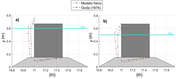 Figura 14 Comparación de las presiones del modelo analítico (Goda, 1974) con las presiones del laboratorio del (a) ensayo 2 y (b) ensayo 3, donde 0.09 m equivale a 1 KPa.
