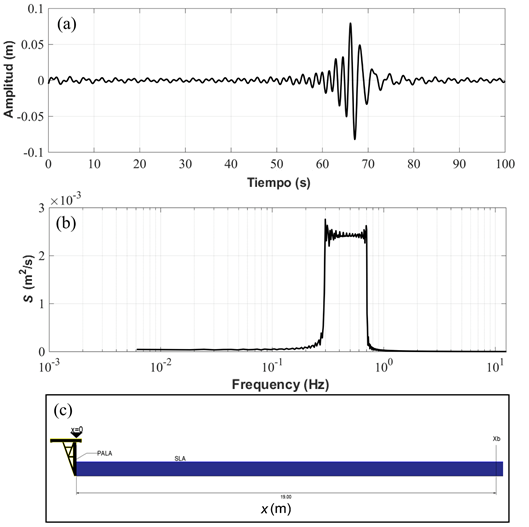 Considerando las características del canal de oleaje se generó un grupo de ondas conformado por 32 componentes. Estudios previos (Rapp & Melville, 1990; Baldock et al., 1996; Baldock, 2006) demostraron una buena representación de este tipo de oleaje utilizando alrededor de 30 componentes. La frecuencia central fc=0.5 Hz, inferior f1=0.3 Hz y superior f2=0.7 Hz se usaron para generar la serie temporal de superficie libre para este estudio (Figura 2a). El tren de ondas generado dio como resultado un espectro tipo “sombrero” (Figura 2b), característico en este tipo de grupo de ondas. El punto de enfoque teórico se localizó en x=19 m (Figura 2c) para un tiempo de cien segundos.