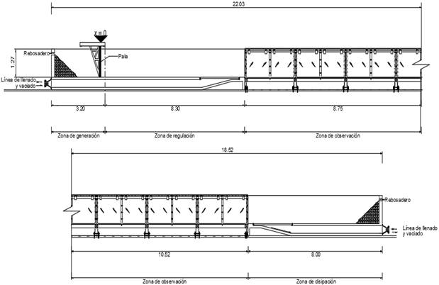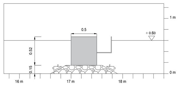El diseño de la tipología de la estructura costera modelada físicamente en el canal del LIPC del II-UNAM corresponde a un dique vertical con banqueta baja (Low Mound Breakwater) a escala 1:20 (Figura 4). El dique y el vertedero para medir el rebase se construyeron con tablas de madera de 3/8''. El vertedero se forró por dentro con láminas de acrílico y se selló con silicón para evitar fugas. Para la banqueta del dique se usó roca caliza y una pendiente de 1:2 (Figura 4).