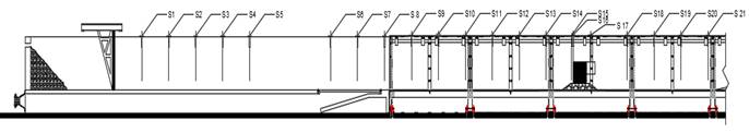 Figura 5 Plano de ubicación de los sensores de nivel en los ensayos de laboratorio. El ensayo 1 tiene el mismo arreglo, pero sin la estructura y con el sensor S16 ubicado a 0.5 m del S15.
